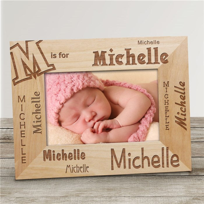 This beautiful frame is engraved throughout with your child's name along with the first initial in the top left corner.